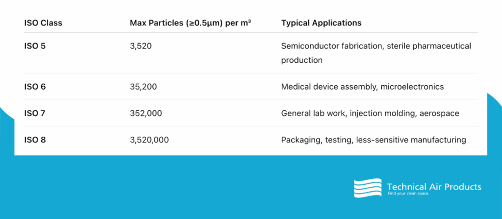 Cleanrooms are classified according to ISO 14644-1, which specifies the maximum allowable particle concentrations for each class. For example: